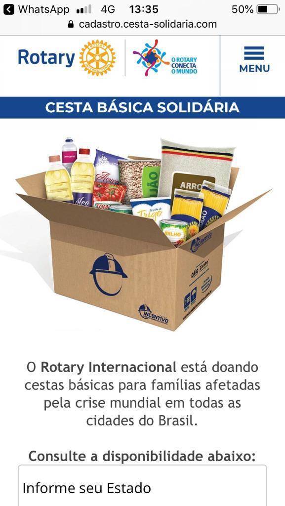 A presidente do RC Cáceres, Rosane Michelis Saravy, ressalta que se trata de mais um caso de fake News (notícia falsa). Ela orienta que o Rotary International NÃO está fazendo cadastro de pessoas por Whatsapp para distribuição de cestas básicas. Caso receba alguma mensagem em seu celular com o título “Cesta Básica Solidária Rotary International”, desconsidere e não insira seus dados.
