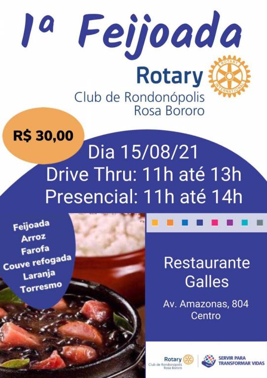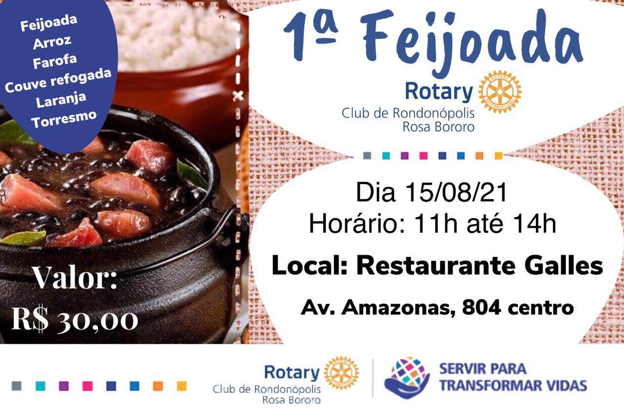 O Rotary Club de Rondonópolis -Rosa Bororo vai promover, no dia 15 de agosto, a 1ª edição da Feijoada, em homenagem ao Dia dos Pais, pelo sistema drive thru e presencial.