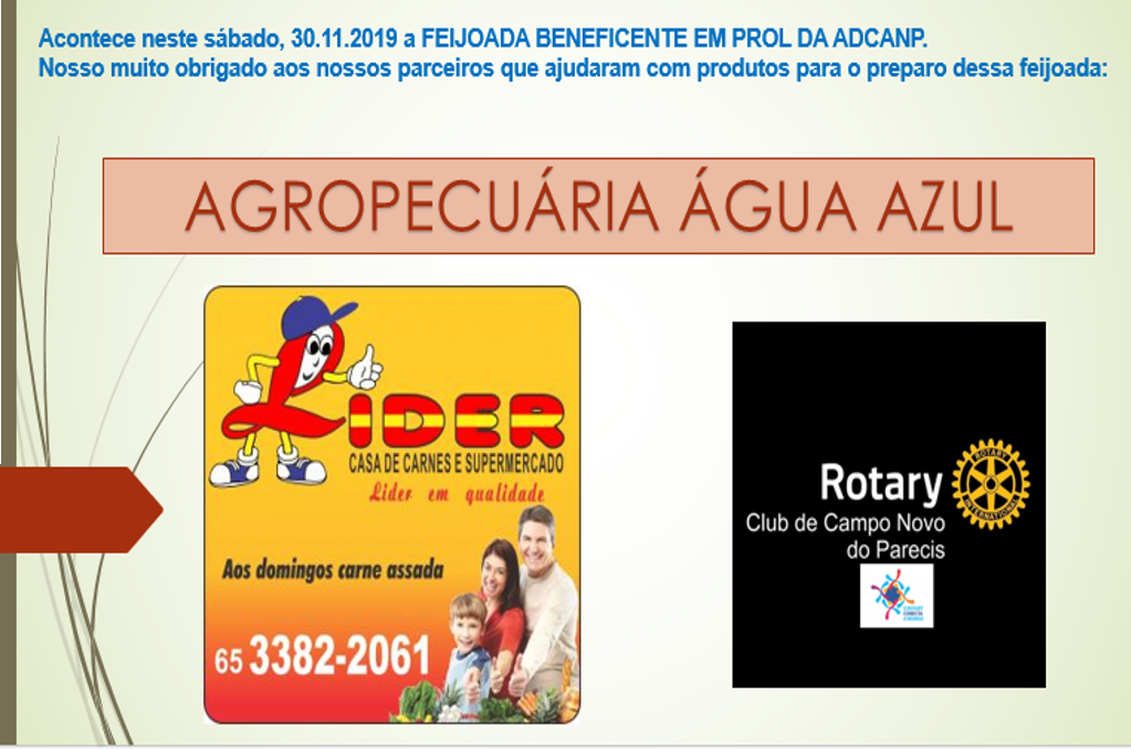 Agropecuária Água Azul, LÍDER CASA DE CARNES E SUPERMERCADO, em parceria com o ROTARY para ajudar a ADCANP. Parceria de vocês foi fundamental.
