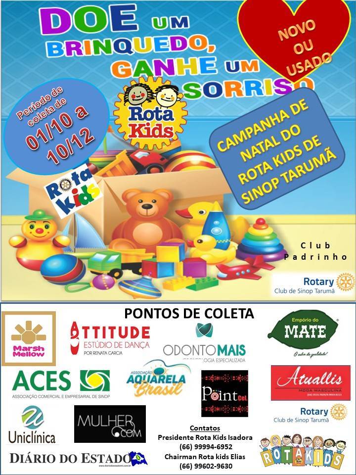 Sob a coordenação do Chairman Elias Moraes de Carvalho, no último sábado dia 14 de dezembro o Rota Kids de Sinop Tarumã realizou a segunda edição do Natal do Rota Kids, com uma estratégia diferente do ano anterior, contou com vários parceiros que colaboraram colocando à disposição um espaço para receber a doação de brinquedos novos ou usados. Foram pouco mais de dois meses de arrecadação que foi um sucesso a idéia adotada pelo clubinho , a Presidente Isadora Castro Medina juntamente com seus companheirinhos fizeram a triagem dos brinquedos usados recuperando os que foram necessários. O evento foi realizado na EMEB Silvana localizada na estrada Silvana, Zona Rural. Em uma tarde de muita alegria com brincadeiras diversas, distribuição de doces e sanduíches as crianças receberam a visita do Papai Noel, momento mágico com crianças. Para que esse evento tivesse todo esse sucesso tiveram a colaboração do Interact, que sempre se dispõe ajudar nos eventos dos Kids e as mães de kidianos que também não mediram esforços.