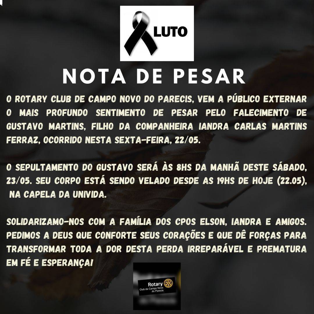 O Rotary Club de Campo Novo do Parecis, vem a público externar o mais profundo sentimento de pesar pelo falecimento de Gustavo Martins, filho da CoMpanheira Iandra Carla Martins Ferraz, ocorrido nesta sexta-feira, 22/05.