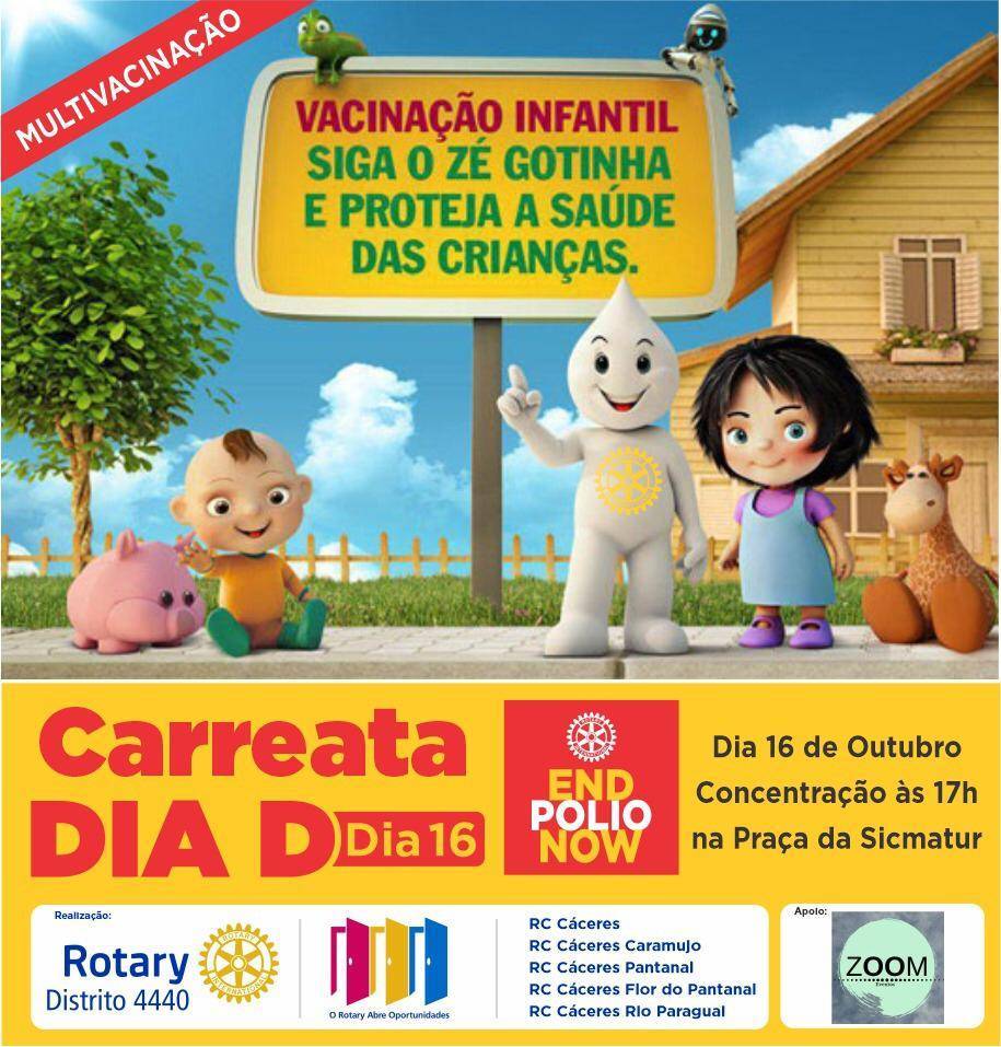 Além dos voluntários do Rotary, a carreata contará com os personagens Zé e Maria Gotinha, bem como o apoio do Corpo de Bombeiros e Zoom Eventos.